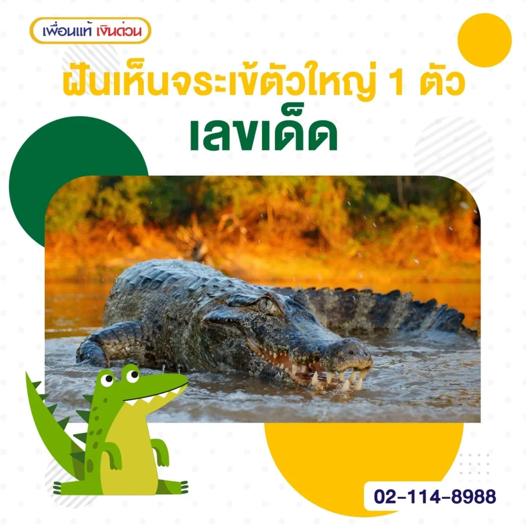 การฝันเห็นจระเข้บ่งชี้ถึงความเป็นไปได้ที่คุณกำลังเผชิญหน้ากับความอันตรายหรือเหตุอุบัติเหตุภายในที่อยู่อาศัยของคุณ นอกจากนี้มีความเปลี่ยนแปลงเกี่ยวกับงาน ที่อยู่อาศัย และความคับขันจากบุคคลที่เข้ามาสร้างปัญหาให้คุณอยู่เรื่อย ดังนั้น หากคุณฝันถึงจระเข้ ควรระมัดระวังต่อความเป็นไปได้เหล่านี้ ลองหาโอกาสทำบุญเพื่อเสริมดวงชะตาและพยายามใช้ชีวิตอย่างระมัดระวังตลอดเวลา