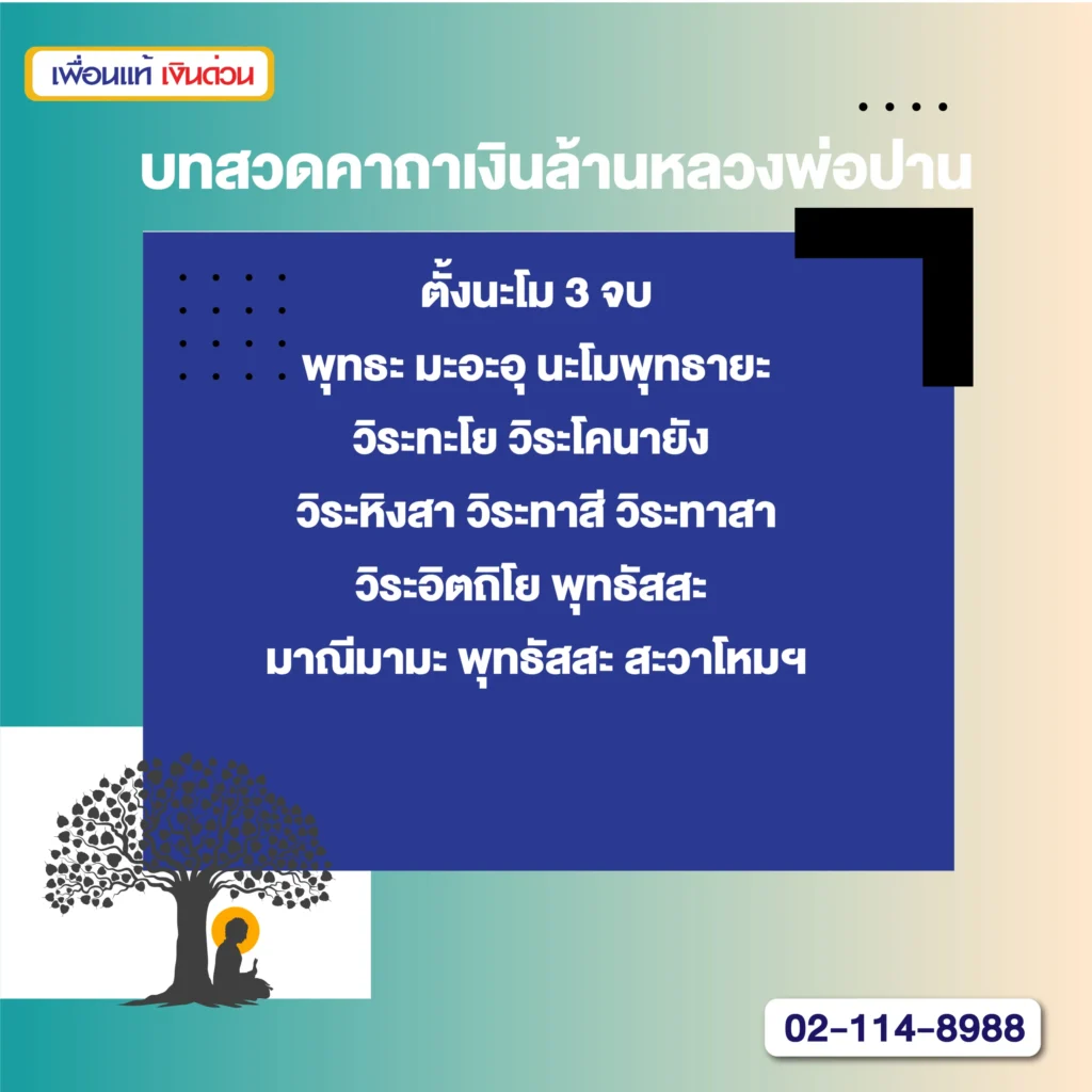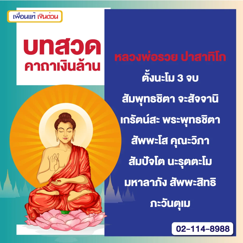 บทสวดคาถาเงินล้าน สวดให้รวย เรียกเงินล้าน เรียกโชคลาภเงินทอง เป็นการบูชาหรือกราบนำคำสั่งทางจิตใจเพื่อเรียกเก็บความร่ำรวยและโชคลาภที่เชื่อว่าปรากฏในรูปแบบของเงินทองมากมาย บทสวดนี้มีเจตนาเป็นการสร้างพลังบวกบางอย่างที่นำพาคนที่บูชาไปสู่การเจริญรุ่งเรืองในด้านการเงินและโชคชะตา สามารถใช้เป็นรูปแบบของศาสนาหรือความเชื่อทางศิลปะและวัฒนธรรมต่าง ๆ ที่เน้นการติดต่อกับพลังจิตใจและความสุขในด้านเงินทอง
